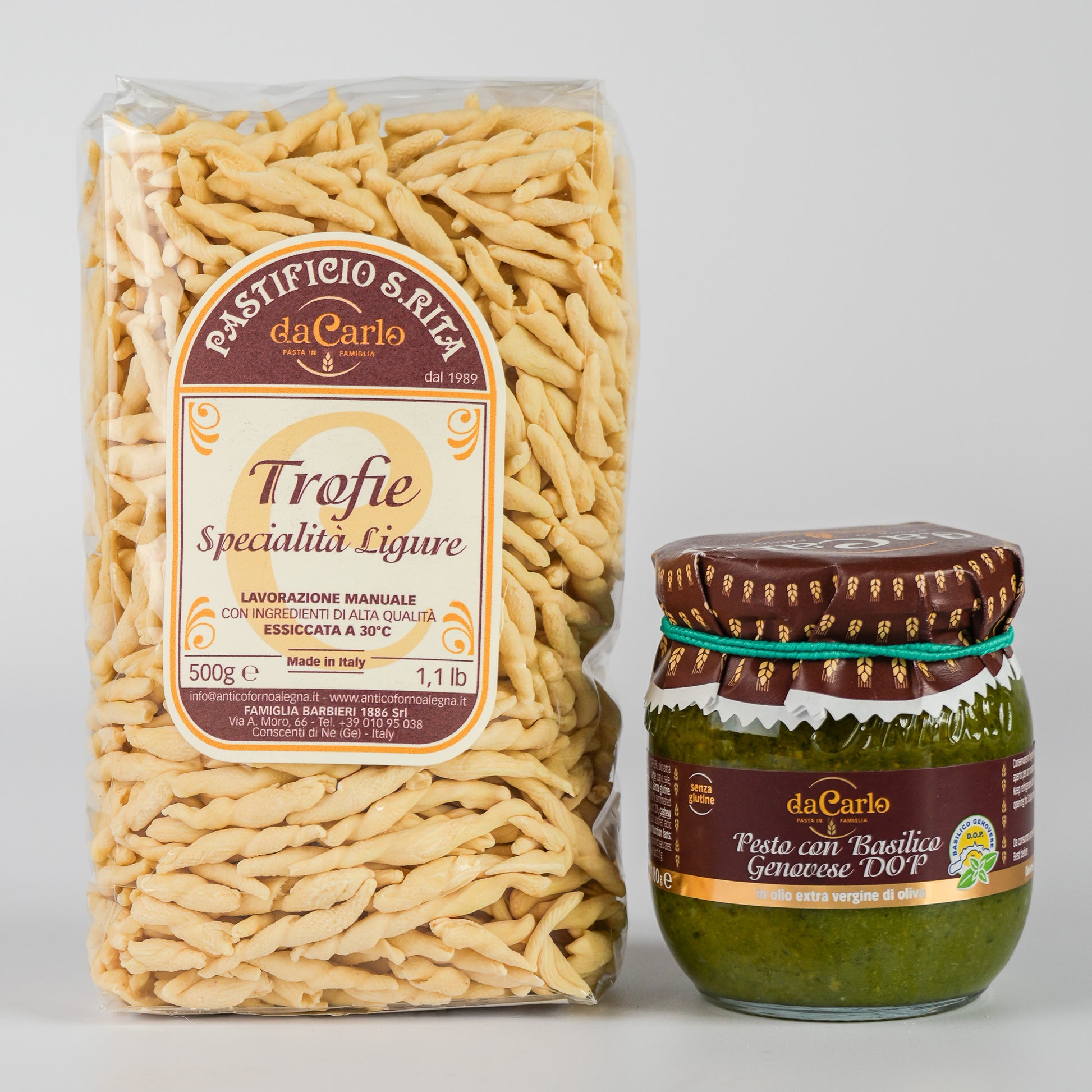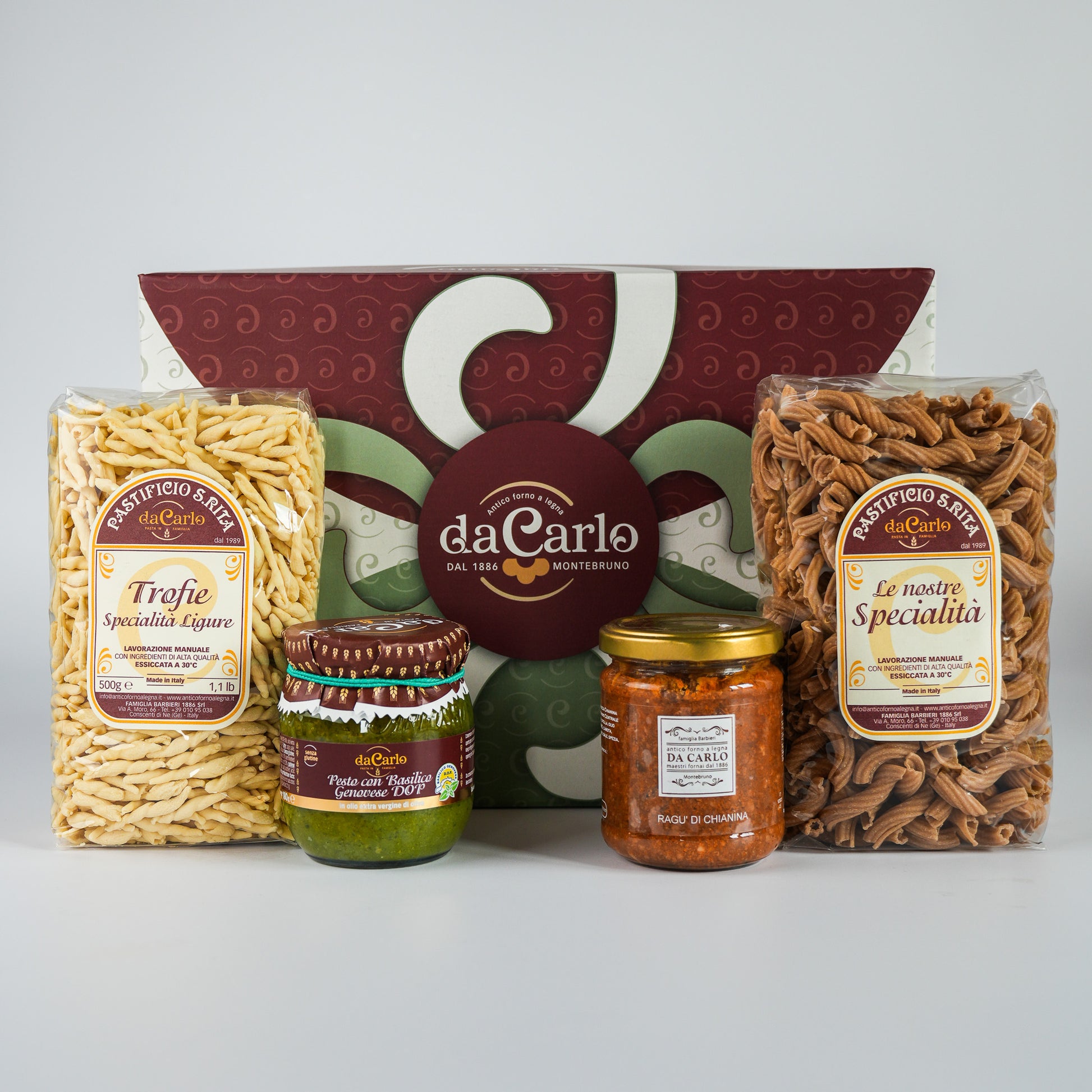 Dentro trovi tutto il necessario per preparare in pochi minuti due primi diversi: le trofie con pesto genovese DOP, per un piatto fresco e classico, e la pasta Rustichella 100% integrale con ragù di carne chianina, per un’alternativa dal gusto più intenso.